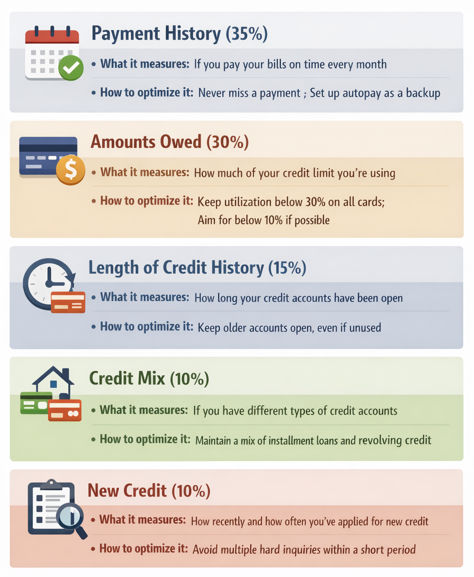 Your FICO score is not random — it’s a precise calculation built from five categories of financial behavior. Here’s a breakdown of each factor, from most to least impactful: