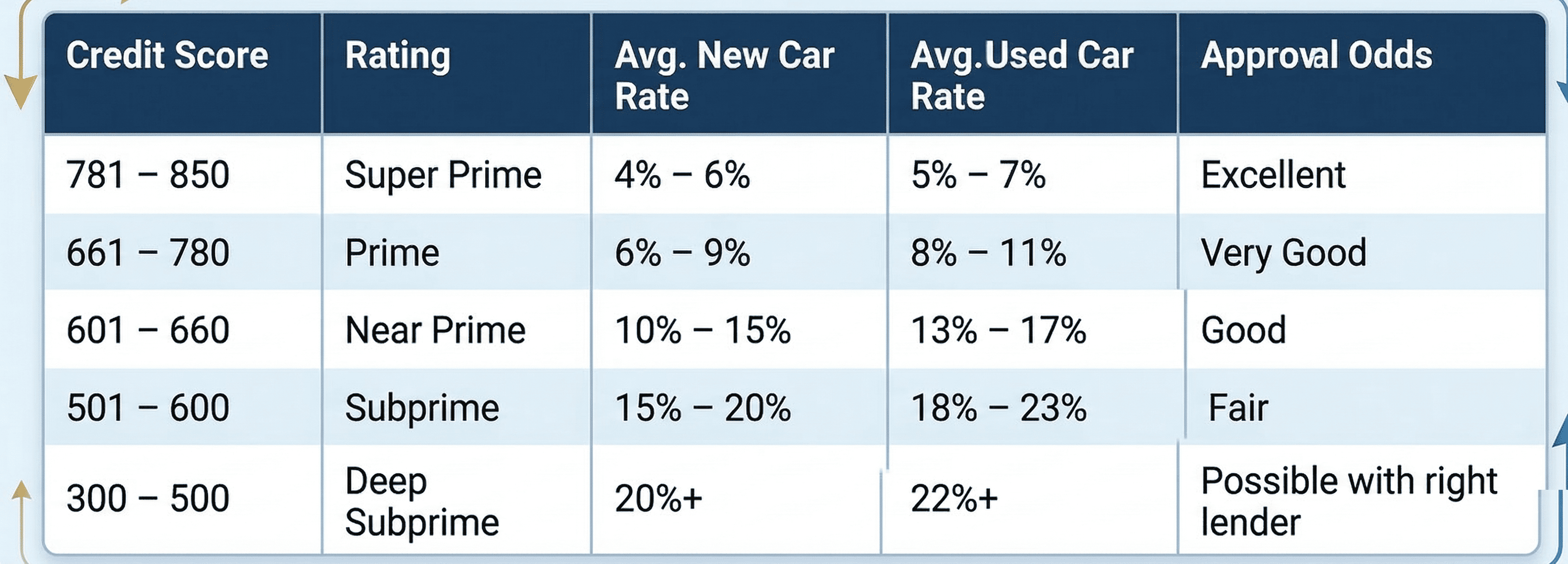 A co-signer with stronger credit can improve your approval odds and may help secure a better rate. For borrowers with low scores or limited history, a co-signer can sometimes make the difference between a decline and an approval.